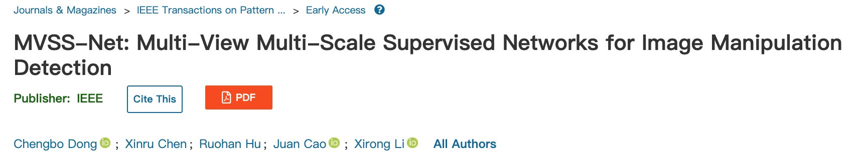 Chengbo Dong, Xinru Chen, Ruohan Hu, Juan Cao, Xirong Li. MVSS-Net: Multi-View Multi-Scale Supervised Networks for Image Manipulation Detection. IEEE Transactions on Pattern Analysis and Machine Intelligence (T-PAMI), 2022