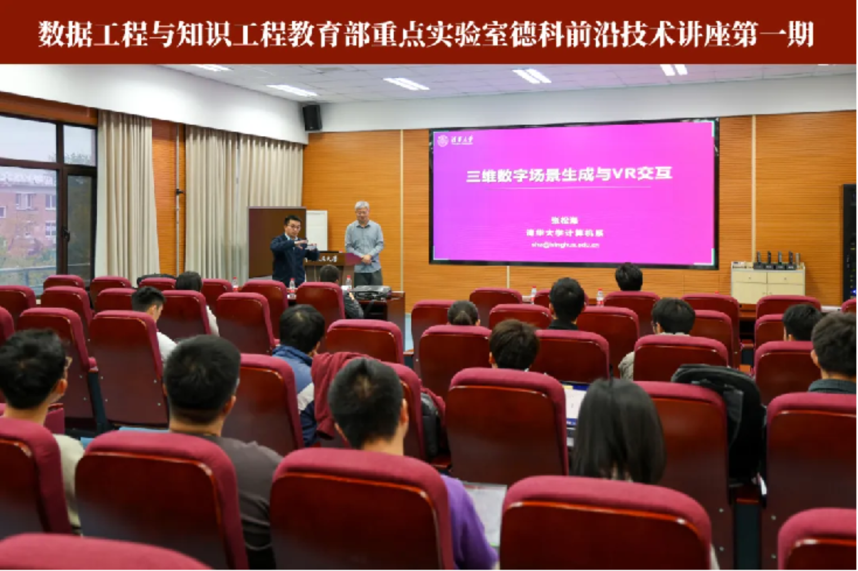 11月13日下午,数据工程与知识工程教育部重点实验室举办第一期德科前沿技术讲座。本期讲座的主题为“三维场景合成与VR交互”,由清华大学计算机系长聘副教授张松海主讲,由数据工程与知识工程教育部重点实验室教授汪云海主持。