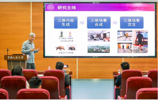 张松海老师首先从LBE大空间VR展示的火爆现象切入,随后以“三维内容生成、三维场景合成和三维场景交互”为核心议题展开深入探讨。在三维内容生成方面,他着重介绍了“单视角图像到三维模型”和“文本到三维模型”的技术路径。谈及三维场景合成,张老师指出,如何以简单高效的方式创造出“合理”的场景,是当前亟待突破的难题。他以室内和室外的三维场景生成为例,阐述了室内场景生成通过规则挖掘和设置来输出布局合理的空间,而室外场景生成则借助大语言模型,允许用户通过自然语言输入来构建和修改空间布局。在三维场景交互环节,张老师讲解了用户如何通过手工交互来编辑物体布局,使得三维场景编辑变得更加高效便捷。