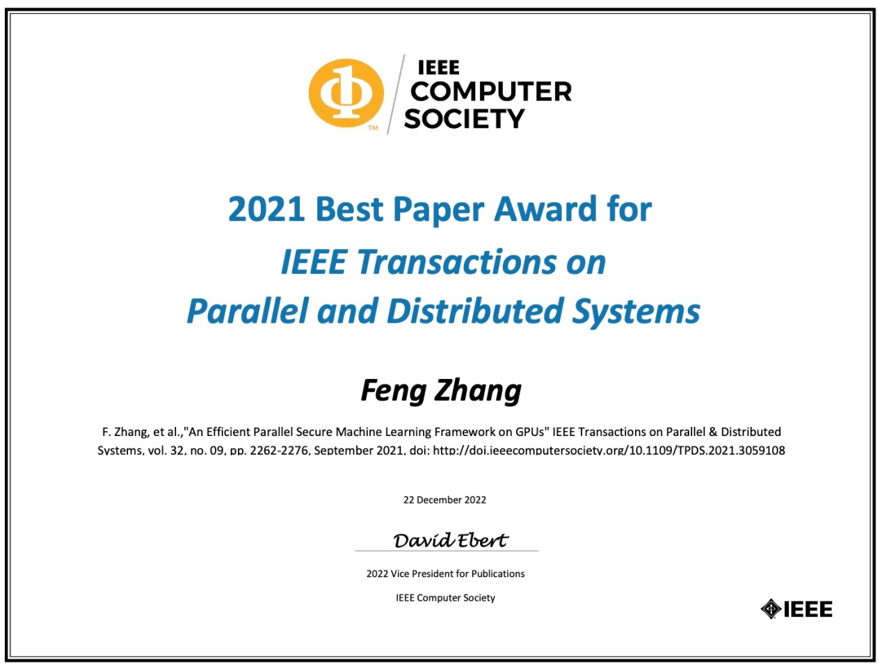 近日, IEEE学会并行与分布式系统汇刊TPDS(IEEE Transactions on Parallel and Distributed Systems)公布了2021年度最佳论文,我校张峰副教授为第一作者的论文“An efficient parallel secure machine learning framework on GPUs”荣获TPDS 2021年度最佳论文。IEEE TPDS是中国计算机学会(CCF)推荐的A类期刊,在并行与分布式计算领域享有很高的学术声誉。经统计,2021年TPDS总发文量为297篇,根据惯例会评选出一篇年度最佳论文和一篇最佳论文提名。