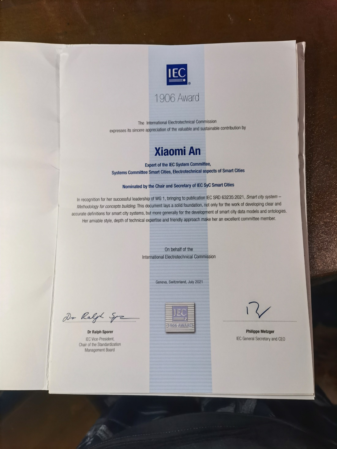 2021年,为表彰安小米教授担任国际电工技术委员会智慧城市系统委员会术语工作组召集人期间的有效领导,以及成功带领IEC SRD 63235:2021智慧城市系统-术语构建方法论的起草发布,经由国际电工技术委员会智慧城市系统委员会主席和秘书提名,安小米教授荣获2021年度国际电工技术委员会(IEC)1906奖。