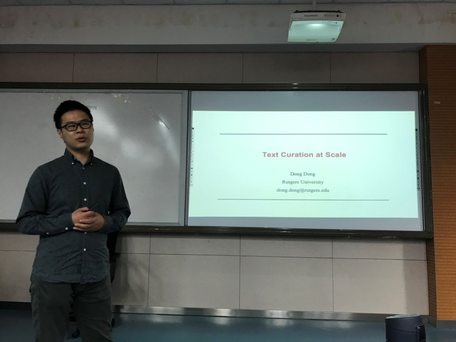 4月22日下午,应重点实验室张峰博士的邀请,美国罗格斯新泽西州立大学计算机系助理教授邓栋博士于信息楼4层报告厅作了名为“Text Curation at Scale”的报告,介绍了在文本大数据中重复数据检测的研究成果。