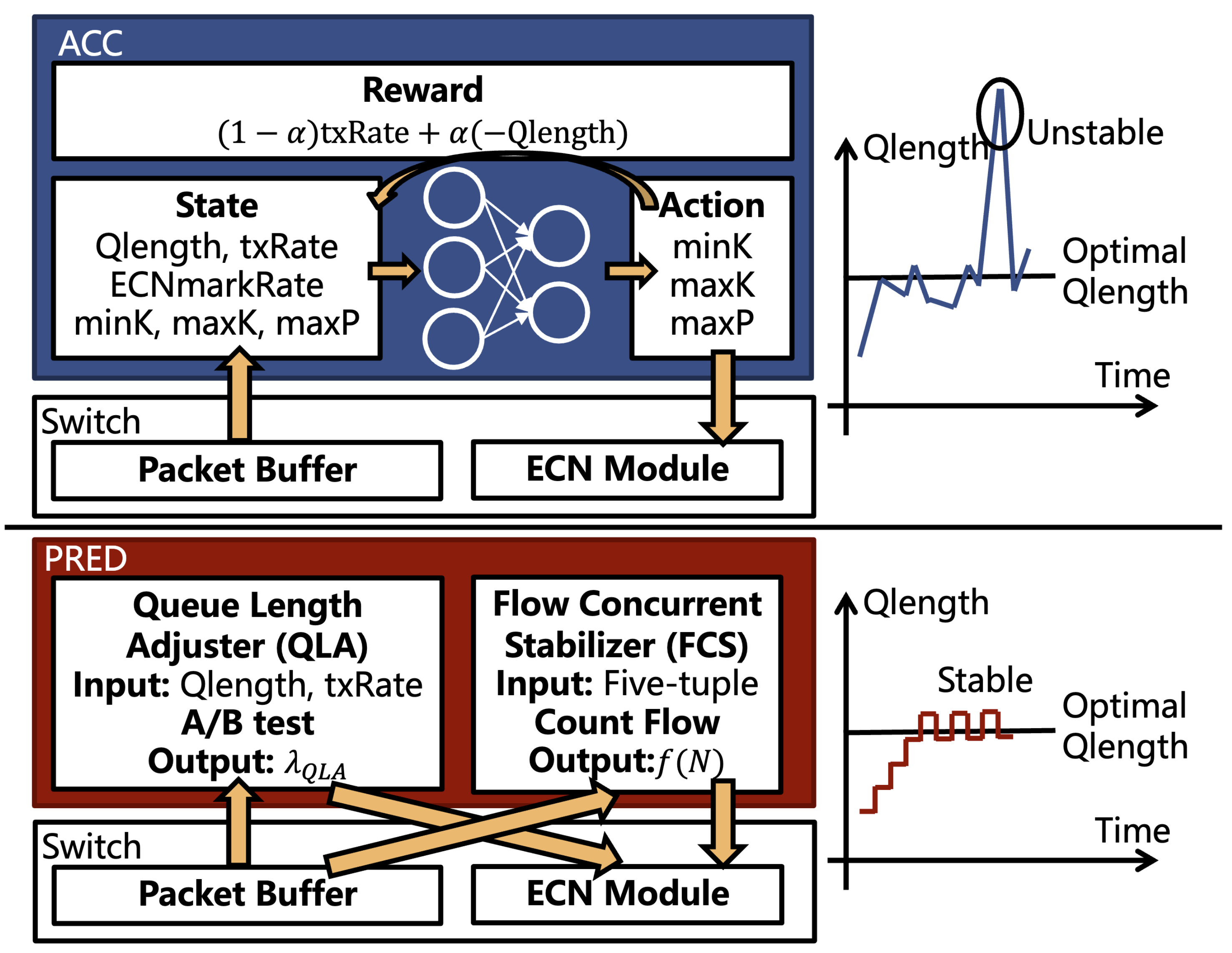 论文概述:Random Early DetectionRED)作为基础的主动队列管理(AQM)技术,过去几十年在数据中心交换机中得到了广泛应用。精确配置RED参数对于实现高吞吐量和低延迟至关重要。然而,由于数据中心网络工作负载的高度动态性,使用静态配置的RED参数难以实现稳定高性能。先前的研究应用强化学习来预测合适的阈值,但由于不稳定性导致其在实际部署中表现不佳。本文提出了PRED,一种新颖的系统,能够在流量动态变化时自动稳定地调整RED参数。PRED使用两个松耦合系统,即流并发稳定器(FCS)和队列长度调整器(QLA),克服了动态设置RED参数以适应不断变化的流量模式的挑战。我们在基于P4可编程交换机的物理测试平台和基于NS3的大规模仿真中进行了广泛评估。结果表明,PRED能够跟上由现实工作负载生成的实时网络动态。例如,与基于静态阈值的方法相比,PRED能够减少66%的交换机队列长度,并获得高达80%的流完成时间(FCT)降低。与最先进的基于学习的方法相比,PRED能够将尾部FCT降低34%