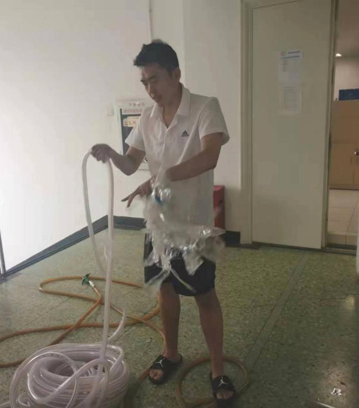 由于近期气温持续升高,有两个服务器机房的空调相继出现高压警报和停机情况,服务器机房的温度一度高达30多度。如不及时处理,存在空调停机、服务器机房温度升高,导致机器过热损毁的风险,影响师生使用计算集群。葛加可同学紧急采取扫帚扫和泼水等方法来清扫空调室外机,使得空调暂时恢复了运行。然而,22日中午,空调又出现了报警情况。居家办公的教职工紧急联系了学校后勤集团求助,在杨立伟部长协调下,后勤集团韩磊老师帮忙找来水管,和葛加可同学一起,顶着炎炎烈日,历时三个多小时,共计冲洗了位于房顶的5台空调室外机,最终化解了机房险情。谱写了一曲师生齐心协力,校内校外积极配合,共克时艰,保障服务器机房安全运行的佳话!