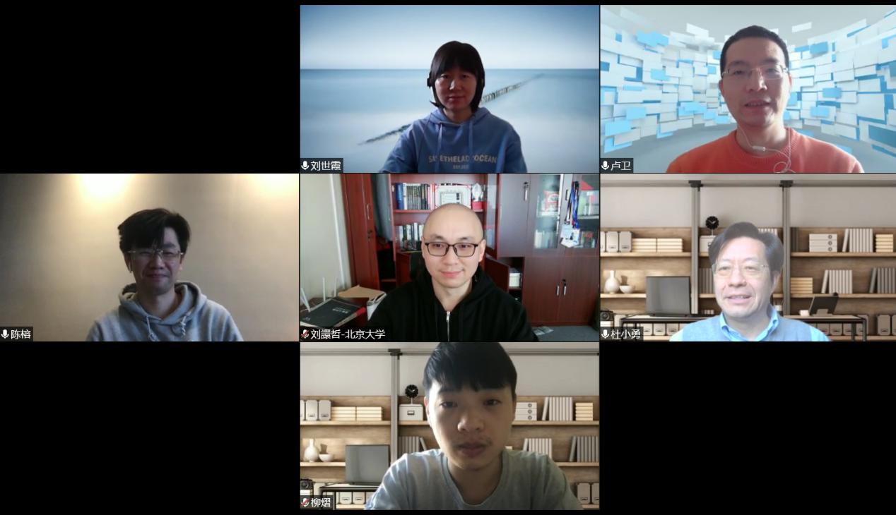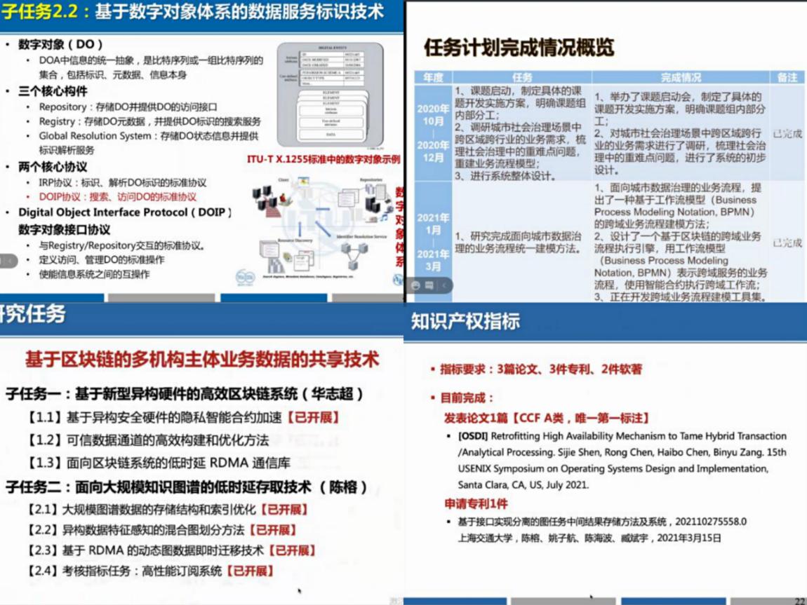 汇报会由项目负责人杜小勇教授主持,我校重点实验室卢卫副教授、北京大学刘譞哲副教授、清华大学刘世霞副教授和上海交通大学陈榕教授4位课题负责人参加会议并分别作课题进展情况汇报。卢卫副教授课题组初步完成了人口库关联数据的语义对齐及正确性校验工具开发,下一步将扩展法人库、电子证照库、政府服务事项库等基础库内部及各基础库之间的关联数据语义对齐及相互校验工具开发。刘譞哲副教授课题组对“基于数字对象体系的数据服务标识技术”、“多粒度多维度链上数据访存策略与加密技术”等几个子任务的进展进行了汇报,并与子课题单位恒瑞通(福建)信息技术有限公司合作产生跨市级、省级的相关应用。刘世霞副教授课题组在子任务“面向城市数据治理的业务流程”中提出了基于工作流模型的跨域业务流程建模方法,设计了基于区块链的跨域业务流程执行引擎,目前正在开发跨域业务流程建模工具集,同时与快手合作训练数据质量提升。陈榕教授课题组已开展子任务中的基于异构安全硬件的隐私智能合约加速、数据特征感知混合图划分方法、基于RDMA的动态图数据迁移技术等,并完成发表一篇论文、申请一件专利、培养两名硕士研究生的指标要求。